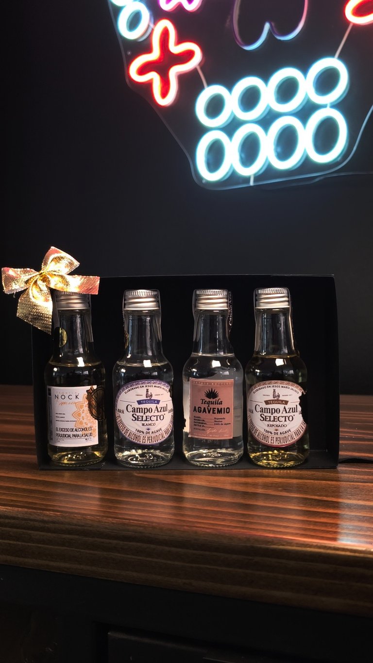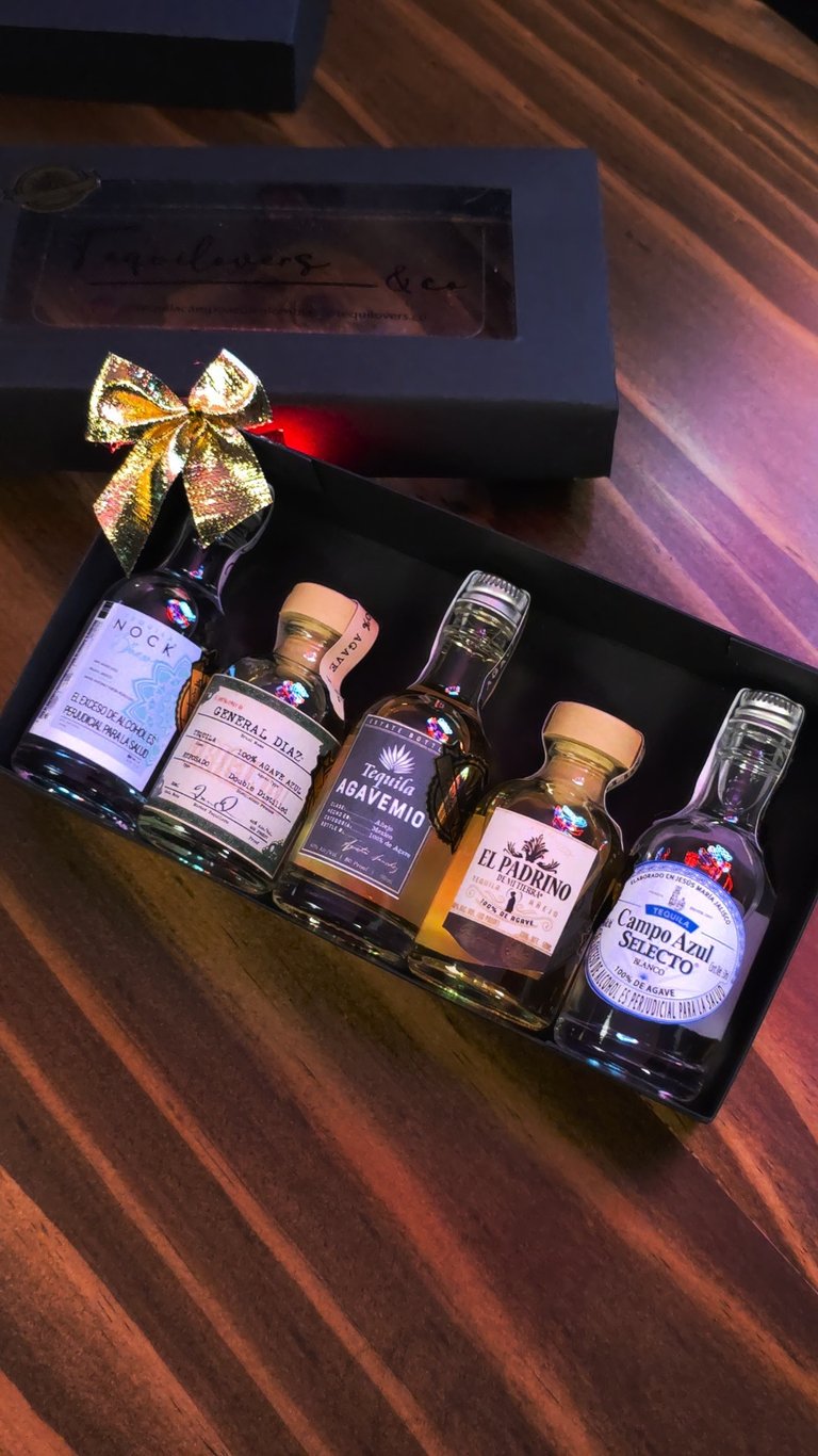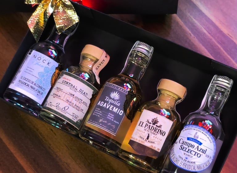 Cada kit incluye una selección aleatoria de 5 marcas de tequila en formato mini como: Campo Azul, General Díaz, Agave Mil, Padrino y Nock. ¡Nunca sabes cuál combinación te va a tocar, y eso es parte de la magia!